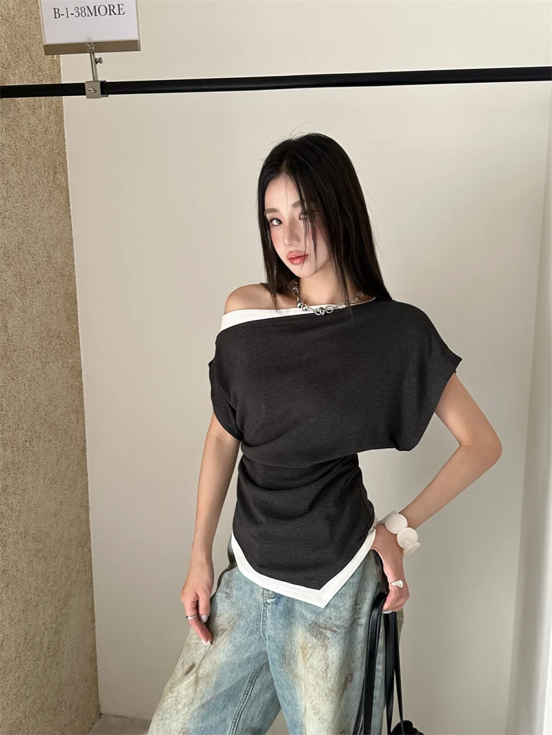 off Shoulder Patchwork Asymmetrical Top for Woman 2025 Summer T Shirt Designer Tees Solid Top Clothing